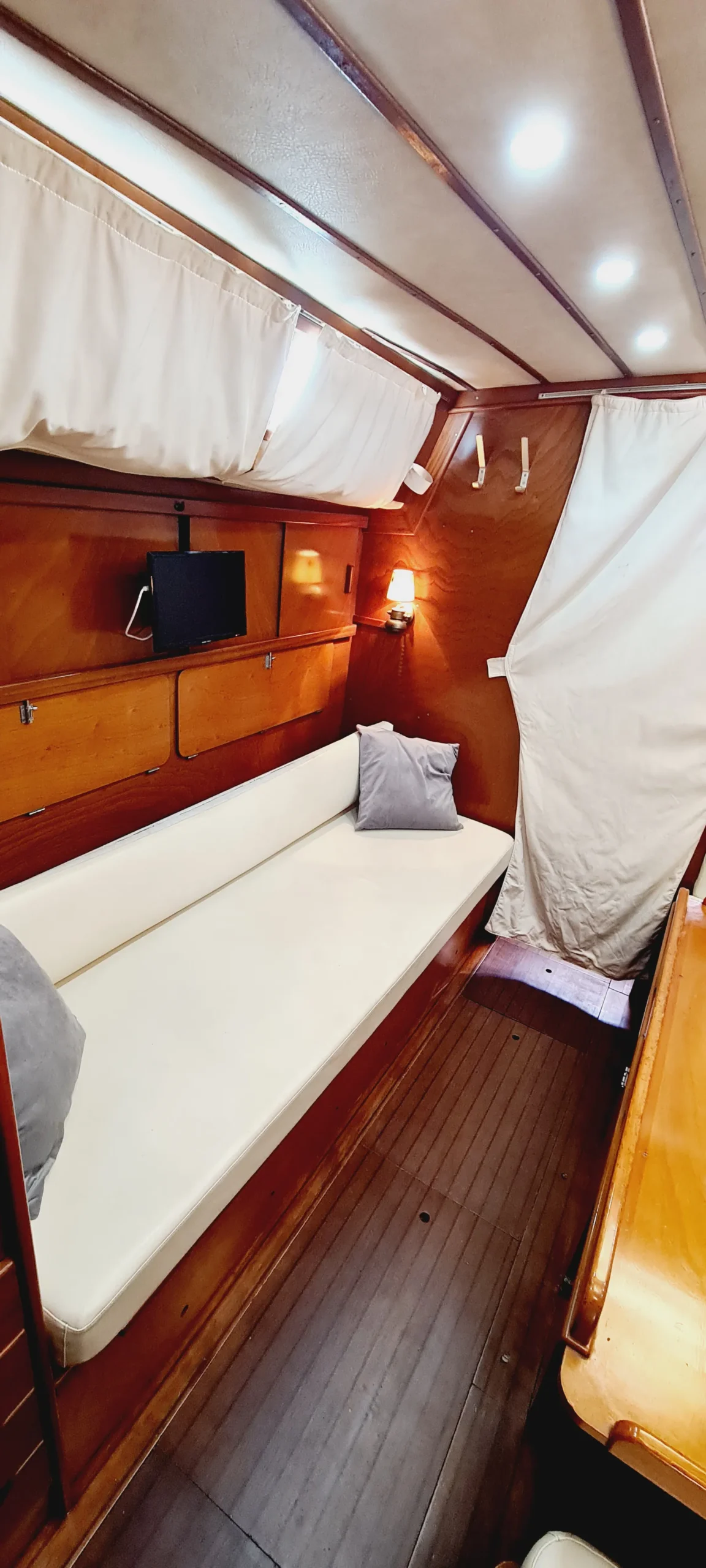 Camarotes: Dos cabinas dobles que susurran descanso y confidencias, un salón que se convierte en cama extra para soñar bajo estrellas marinas.